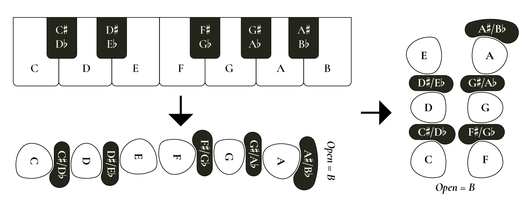While Aurelia’s key layout lends itself to diatonic keys, it is natural to play chromatically as well. The lowest key on Aurelia—the A#/Bb key—when pressed in combination with any other key raises the pitch by a semitone. In practice, this allows the experienced woodwind player to use a familiar “pinky key” mechanism from their primary acoustic instrument in a new way while playing Aurelia.